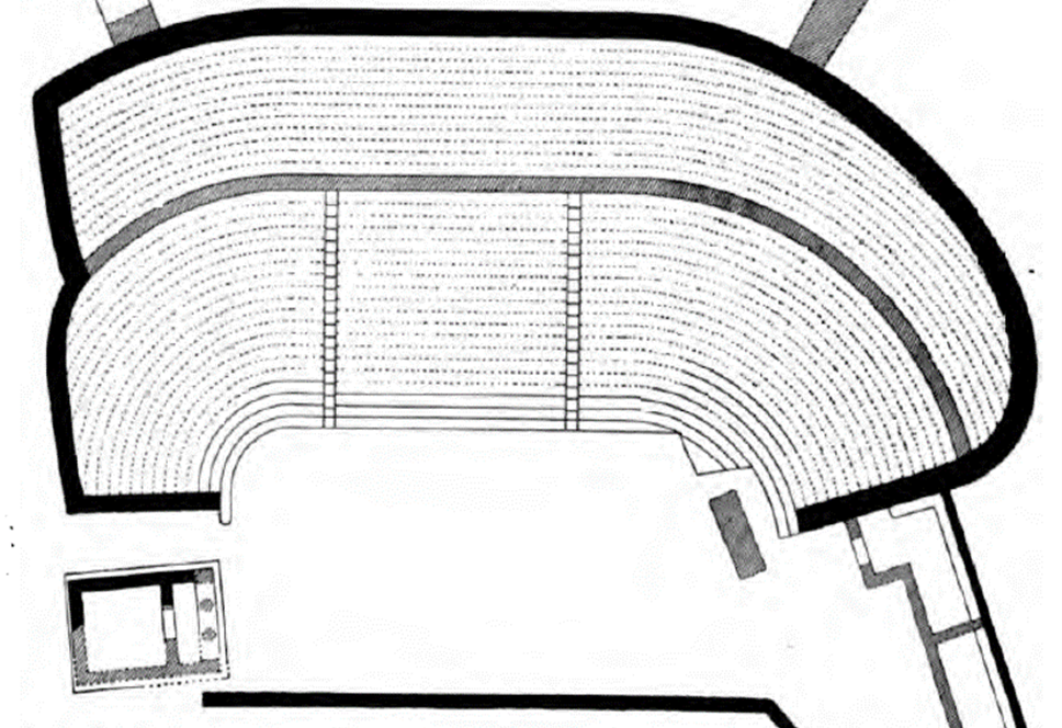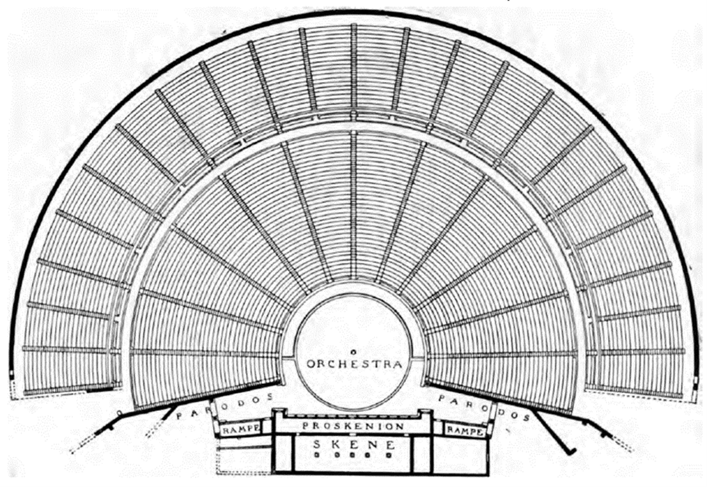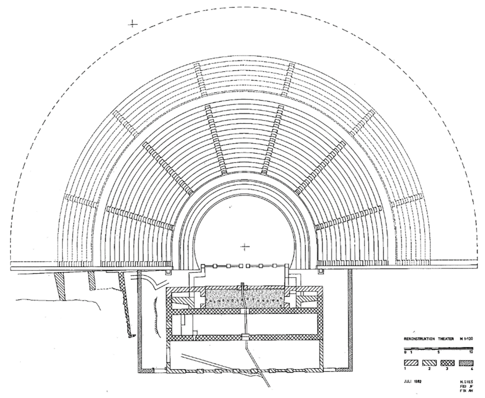 The early Greek theatres had linear seat rows (Figure 1), but during the fourth century BCE (Before Common Era) the canonical theatre type was developed. It is characterised by semicircular seating area (koilon) with steeply sloping seat rows and a circular orchestra (Figure 2). The seating area could also exceed a 180 degrees semicircle. The theatres were built in places with a natural sloping ground.