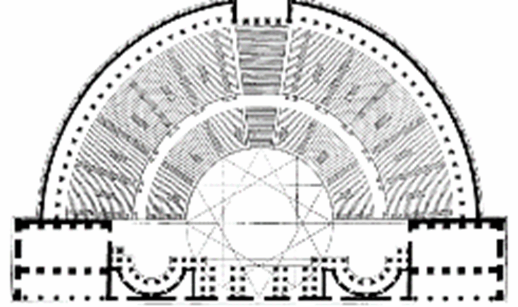 Roman theatres developed during the first century BCE. In Rome, the first permanent stone theatre was built by Pompejus and opened 55 BCE. The Roman theatres were usually built in a city centre and not necessarily in a naturally sloping setting as the Greek theatres. The seating area (cavea) was semicircular and with a steep slope, but the orchestra was smaller than in the Greek theatres and reduced to a half circle. The scene building was increased to be several stories high and could have a canopy sound reflector above the scene. Surrounding the audience was a colonnade connected to the scene building (Figure 4).